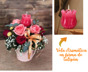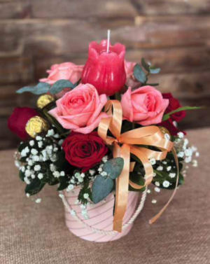 L930.00 ISVDescripción: Creativo arreglo floral elaborado con 4 rosas shimmer, y 4 rosas rojas entre una vela aromática en forma de…