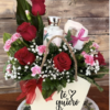 Hermoso arreglo floral elaborado con 5 rosas y mini clavel, lo acompaña una crema de cuerpo bath & body y jabon organico LOCCITAINE y toallita expuesto en base de madera artesanal