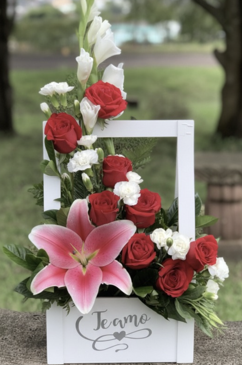 L1,350.00Descripción: Arreglo floral elaborado con 10 rosas rojas, lirio y flores complemento, expuesto sobre una base artesanal. Incluye serigrafía de… -