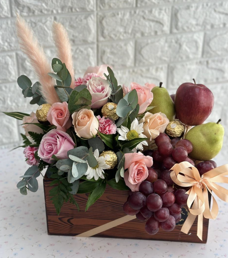 L1,750.00Hermoso frutero elaborado con uvas, peras y manzanas. Lo acompaña un arreglo de rosas color pastel y cola de zorro.… -